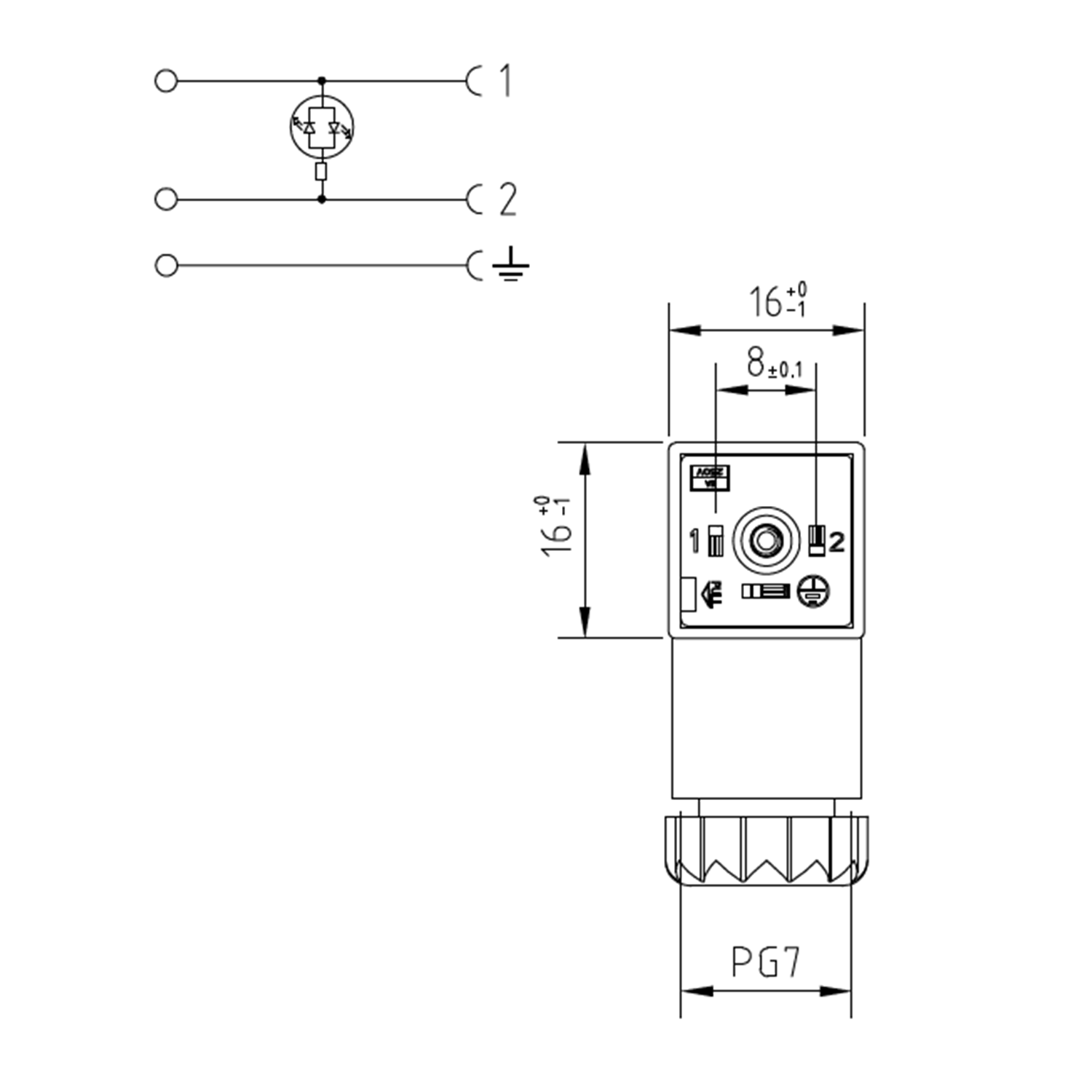 Soket, ledli, kare, 16x16x26mm, ayak aralığı 8mm, 2+1 kutup, akım korumalı, 230V AC/DC