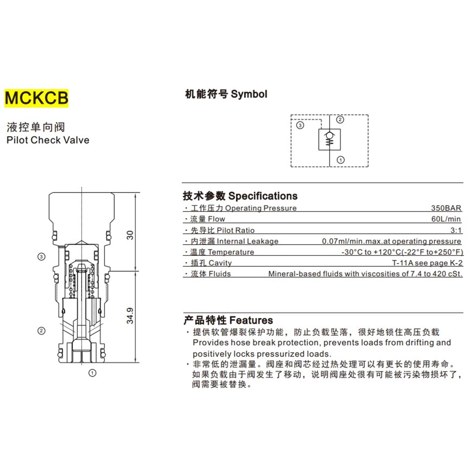 Çekvalf, pilotla açılan, sızıntı hatlı, 60 lt, 350 bar (2 bar aç. bas.) 3:1, T-21A