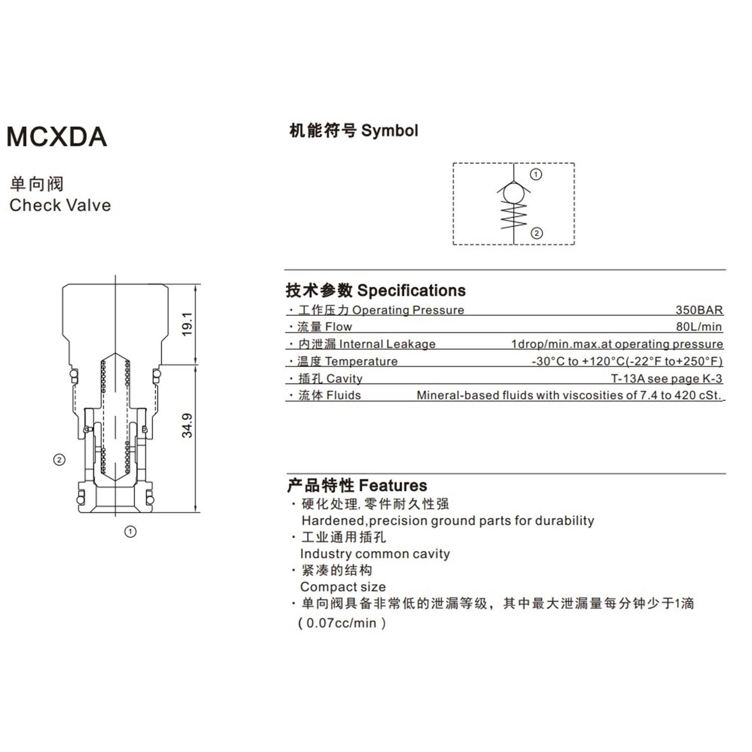 Çekvalf, pilotla açılan, sızıntı hatlı, 60 lt, 350 bar (2 bar aç. bas.) 3:1, T-21A