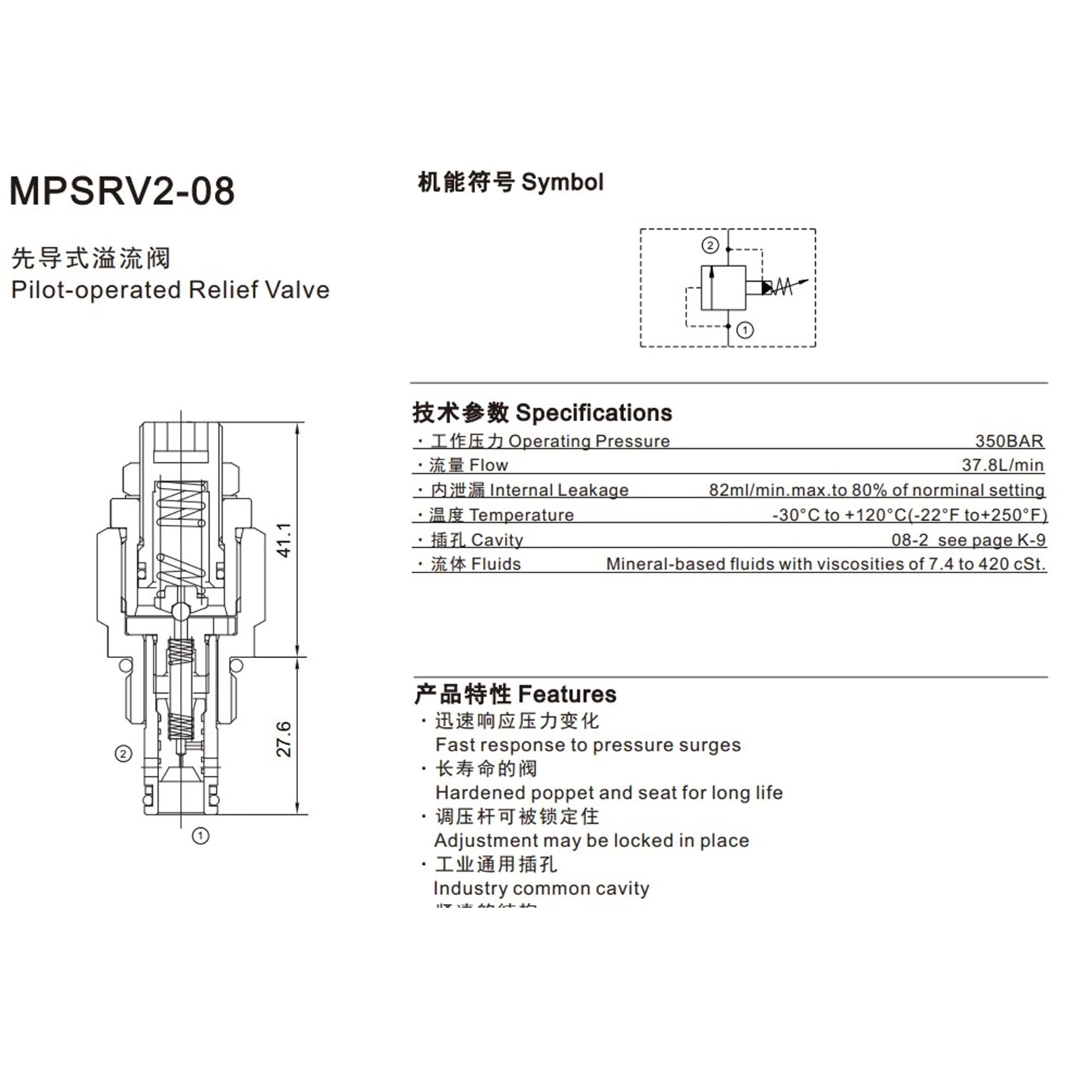 Emniyet valfi, pilot uyarılı, 38 lt, 3,5-350 bar, alyanlı, C08-2