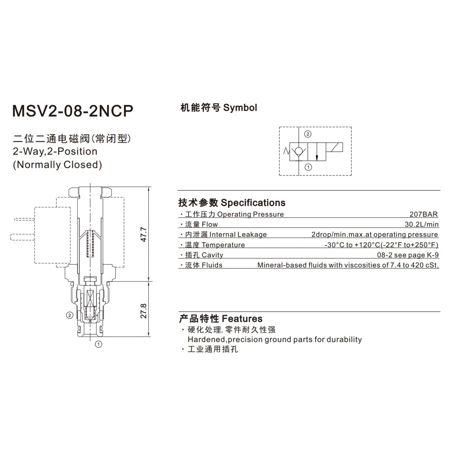 Selonoid valf, 2/2, NK, tek çekli, manuel düğmeli, 30,2 lt, 210 bar C08-2